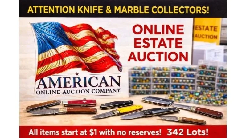 ATTENTION KNIFE & MARBLE COLLECTORS! LIFETIME COLLECTION 1ST TIME TO MARKET! ALL STARTING AT $1 WITH NO RESERVES!